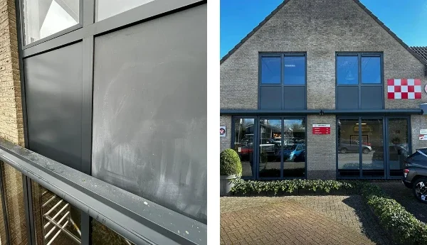 Vakgarage Roest koos ons uit om het aluminium kozijnwerk van hun bedrijfspand een nieuwe, frisse uitstraling te geven. Door jarenlange blootstelling aan de elementen waren de kozijnen verkleurd en licht verweerd.